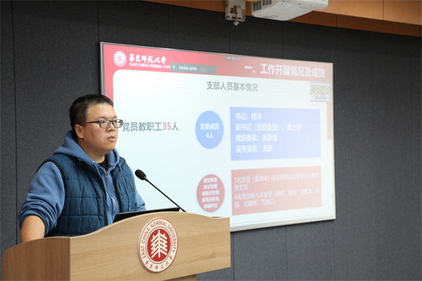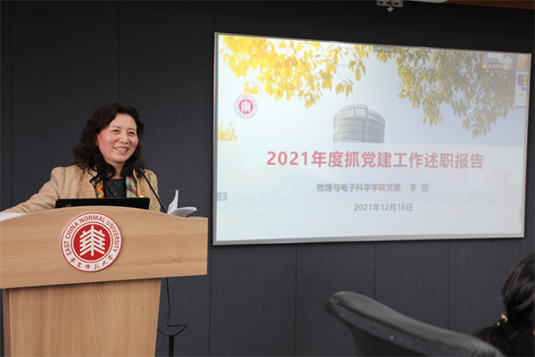 精密光谱科学与技术国家重点实验室党总支副书记马玲、精密光谱科学与技术国家重点实验室教工第二党支部书记贾天卿、物理学系教工党支部书记杨洋、物理实验教学中心教工党支部书记尹亚玲分别进行现场述职。