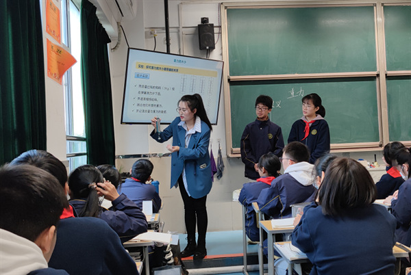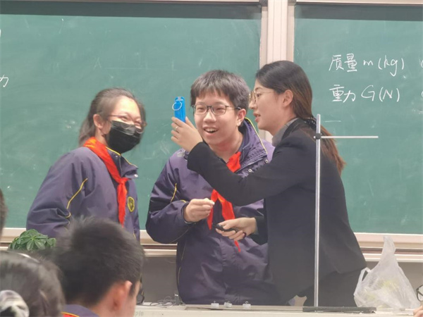 选手赵璐以电影《十二生肖》片段为例,结合“飞流直下三千尺,疑是银河落九天”的古诗,用生活化的语言描述重力现象,阐释物理原理,借助常见实验道具,让学生通过实验,切身感受重力的效应,提升感性认知与理性认知。授课过程深入浅出,层层递进,引人入胜。