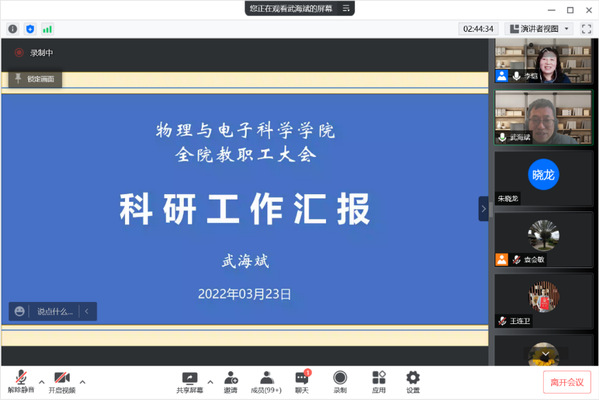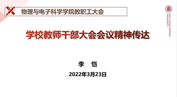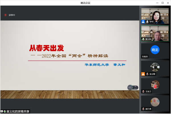 3月23日下午,永利yl23411集团官网在线上召开3月份学院(含精密光谱国重实验室)教职工大会。大会特邀全国政协委员、我校历史系章义和教授作《从春天出发——2022年全国“两会”精神解读》报告。学院领导班子通报了近期重点工作。会议由学院党委书记李恺主持。学院(含精密光谱国重实验室)约290位教职工线上参会。