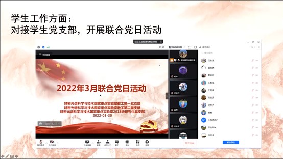 随后,学院教工党支部书记逐一介绍了各支部的主题式特色项目,如物理学系教工党支部以“疫情期间本科生教学质量提升的挑战与创新”为主题,讨论解决教师线上教学困境;材料科学系教工党支部以“考研在线论坛”为抓手,引导学生正确做好学习、职业规划;电子科学系教工党支部推出“云上荐书会”,引导师生居家阅读、陶冶情操;精密光谱国家重点实验室第一、第二党支部主动牵手学生党支部,开展“解密国家自然科学基金的科学密码”主题党日活动,引导师生不忘科技强国使命;行政党支部介绍了学院师生在线问答平台的推进落实情况。除教工党支部外,学生党支部也积极组织特色主题活动,如2021级电子研究生党支部组织开展“keep运动”打卡,倡议师生在封闭管理期间保持运动和自律。