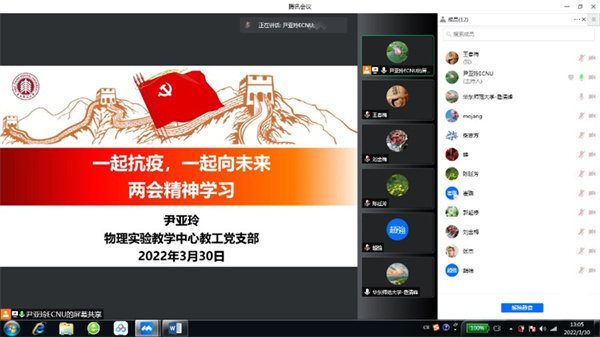 3月30日下午,物理实验教学中心教工党支部组织开展 “一起抗疫,一起向未来”主题党日活动。支部党员以在线会议的形式,围绕学习两会精神、部署教育部高等教育司2022年工作重点、探讨当前疫情防控工作等几个环节展开,会议由支部书记尹亚玲主持。