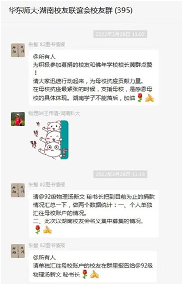 此次爱心捐赠活动得到了湖南校友会李三福会长,易兵、陈赤平等副会长和理事们的大力支持,佛年学校校长黄群、荣誉校友费东平、湘潭校友会等个人和单位积极参加,六十多位校友积极响应,纷纷捐款表爱心,学院湖南本科招生组徐敏、赵振杰也代表学院,参加了此次湖南校友会的爱心捐款。截至3月29日晚8点,湖南校友联谊会共收到爱心款58笔,总计金额65420元。此外,刘华伍、彭万敏和郭殷校友的爱心款,直接汇入了学校基金账户。