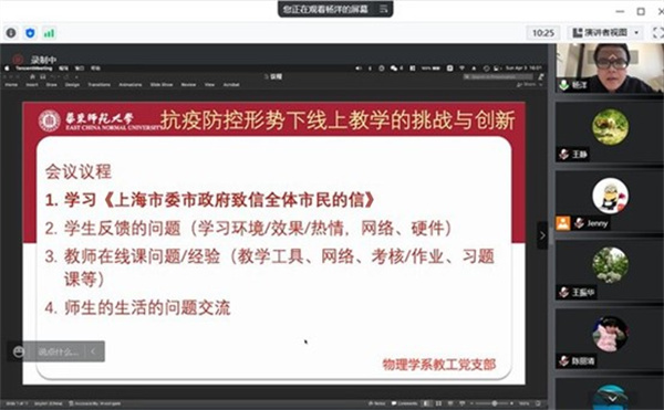 物理学系教工党支部以“疫情期间本科生教学质量提升的挑战与创新”为主题,于4月3日组织开展“守好物理‘云课堂’、打好抗疫阻击战”主题研讨活动,着重讨论解决教师线上教学遇到的重点难点问题。