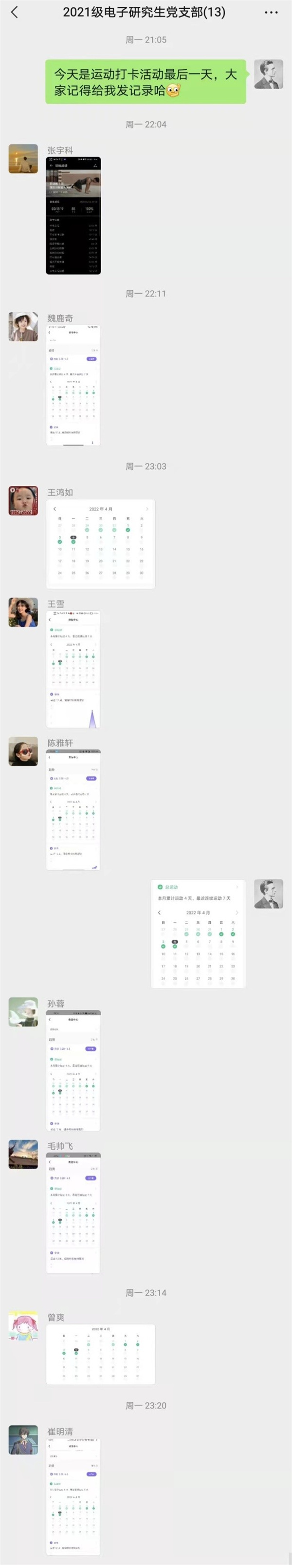 2021级电子研究生党支部自3月28日起,组织开展“keep运动”打卡活动,倡议师生在封闭管理期间保持运动和自律,号召师生每天利用半小时完成身体健康运动计划,增强体质。
