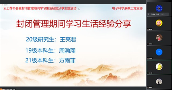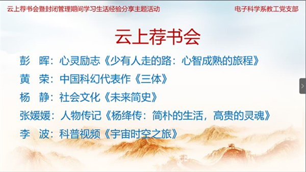 电子科学系教工党支部于4月6日推出“云上荐书会”主题活动,引导师生居家阅读、陶冶情操。同时邀请学院本科生、研究生分别作封闭管理期间学习生活经验分享,帮助同学们学会合理地安排生活,缓解焦虑情绪,增强大家抗击疫情的信心和决心。