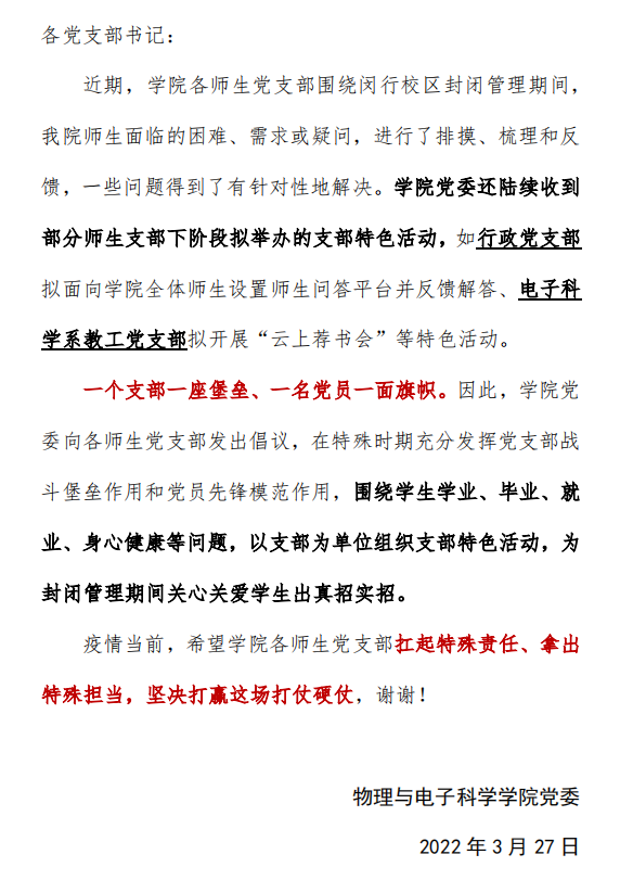 在3月26日全校疫情防控部署会结束后,永利yl23411集团官网党委第一时间向各师生党支部发出倡议,要求各师生党支部围绕封闭管理期间学生的学业、毕业、就业、身心健康等具体问题拿出真招实招,组织特色支部活动,将关心关爱学生落到实处。