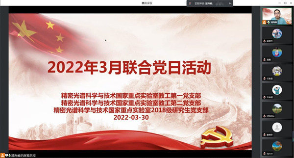 精密光谱科学与技术国家重点实验室第一、第二教工党支部牵手学生党支部,分别于3月30日、4月6日开展“解密国家自然科学基金的科学密码”“从井冈山斗争历史中汲取精神力量”主题党日活动,用专业知识引导师生不忘科技强国使命,用井冈山精神凝聚党员力量、振奋抗疫精神。