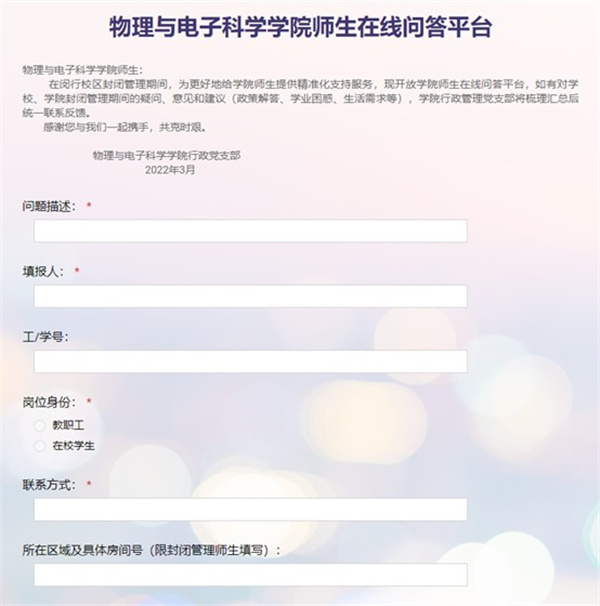 学院党委还同步设立了师生在线问答平台,由行政党支部滚动搜集、集中反馈师生关于疫情防控的疑问,从政策解答、困难解决、情绪疏导等方面,一对一回复个性化问题,形成条块清晰、点面结合的组团式辅导合力。