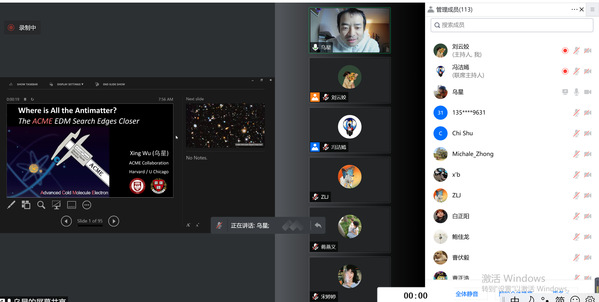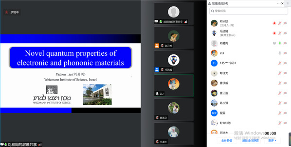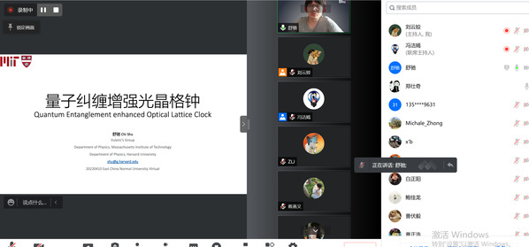 实验室副主任陈少强、张诗按分别主持会议报告。青年学者朱岩博士报告了高端芯片的研发和国产化进程;陈俊逸博士报告了基于量子级联激光器的红外检测系统及其相关应用;乌星博士报告了基于冷分子的电子电偶极精确测量研究;舒驰博士报告了量子纠缠增强光晶格钟的最新研究进展;刘易周博士报告了电、声子材料的新奇量子物性研究;盛继腾研究员报告了基于腔光力的非平衡热力学研究;潘登研究员报告了微纳尺度热辐射中的新物理研究。