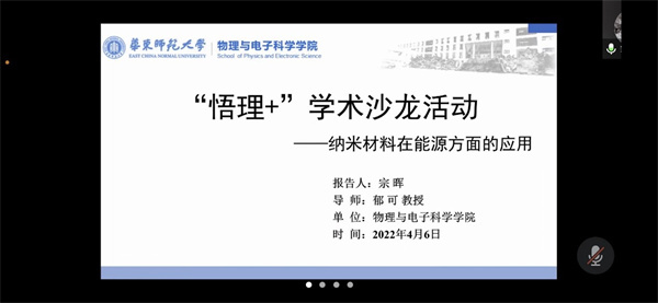 4月6日下午, 由学院研究生会主办的“悟理+”研究生学术沙龙在线举行。2017级理论物理专业研究生霍思宇、2018级物理电子学研究生宗晖和2019级物理电子学专业研究生王九龙分别作主题分享,学院研究生会指导老师黄蕊参加。