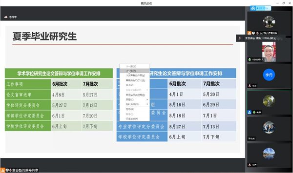 学院副院长胡炳文通报了近期研究生工作情况和毕业就业推进举措。他对夏季毕业生学术学位研究生论文答辩与学位申请工作安排进行了说明,并重点介绍了网络答辩流程和网上投票方式。