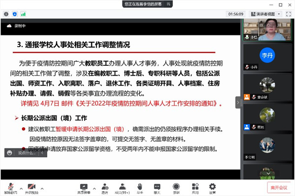 最后,李恺介绍了学校人事处相关工作调整情况和高级职称教职工干部人事档案专项审核工作安排,强调人事档案是全面考察、了解教职工的重要依据,希望老师们准确核对信息,按时补充相关证明材料。
