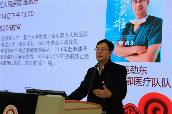 4月14日下午,由永利yl23411集团官网党委主办,电子科学系教工党支部承办的“同上一堂抗疫思政课”党史学习教育主题报告会在闵行校区一教206教室举行,上海市闵行区援鄂医疗队队长施劲东应邀作题为“万里驰援报国心”的专题辅导报告。电子科学系全体教师、学生代表共80余人参加了本次报告会,报告会由电子科学系教工党支部书记黄荣主持。
