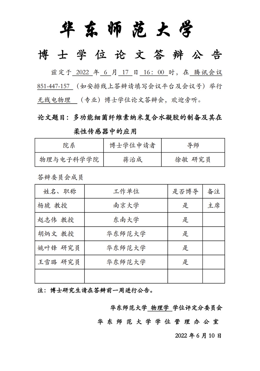 永利yl23411集团官网 博士学位论文答辩公告-蒋治成