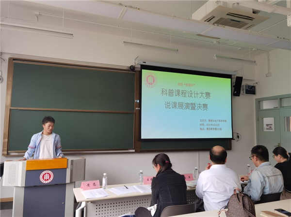 比赛以说课展演的方式进行,第一组为一、二等奖竞争组,每位参赛选手有10分钟说课时间。5位同学分别展示了自己设计的科普课程:自制电风扇、“千杯不倒”小魔术、自动控制开关电路设计等。经过一个小时的精彩讲演,韩婷同学以其贴近生活的课堂引入,出彩的教学内容设计获得了评委老师们的认可,获一等奖。