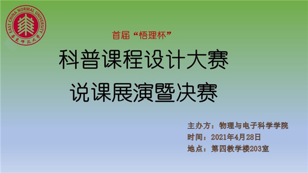 为进一步提高永利官网学生的科普课程设计能力、丰富教学理论知识,4月28日下午,首届“悟理杯”科普课程设计大赛决赛在闵行校区四教203教室举行,决赛选手分为两组进行说课,比赛由2020级无线电物理专业硕士研究生王梦双主持。永利官网2009届校友、常州北郊高级中学物理教师李松,2013届校友、上海市南洋模范中学物理教师唐洋,学院物理实验教学中心教师王春梅、崔璐,研究生辅导员黄蕊担任决赛评委。