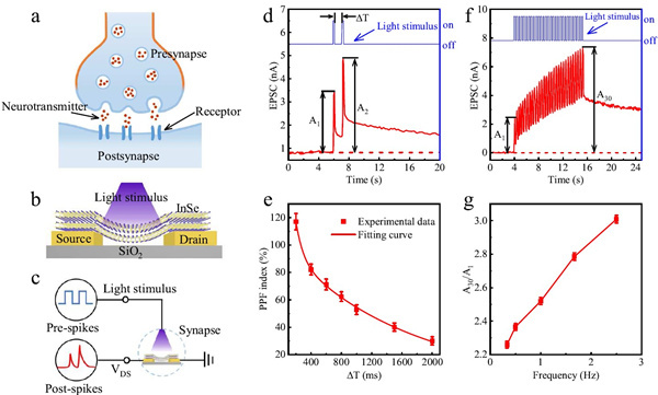 利用弯曲InSe沟道中势阱对光生空穴的捕获行为和持续光电导效应,本工作提出了一种基于挠光电效应的新型光激励突触器件。对这一新型突触器件的测试结果表明其可以有效的模仿生物突触的记忆和学习功能。更为重要的是,还可以通过重复学习实现从短期记忆到长期记忆的转化。