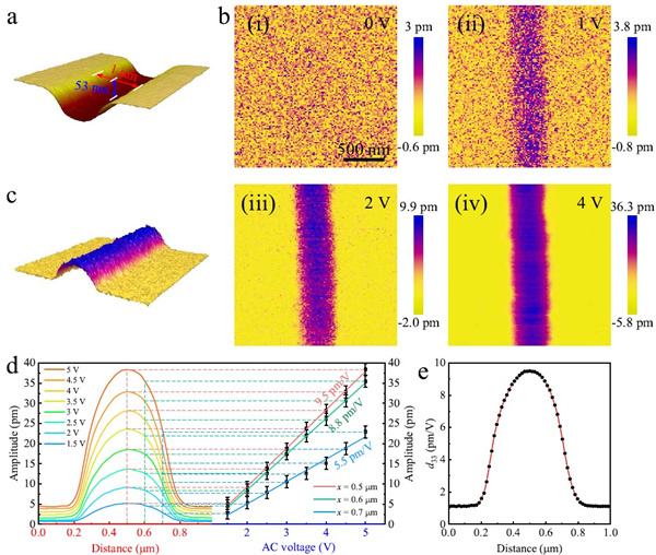 首先,研究者将薄层二维半导体材料完整地转移到特制的图形化衬底上,形成弯曲的沟道。然后利用PFM探针,对弯曲沟道中由应变梯度诱导产生的挠曲极化进行高分辨成像。结果表明弯曲沟道内的挠曲电极化在中心处最强,往两侧逐渐降低并且呈现对称性分布。这也表明了弯曲沟道内的极化电场呈对称分布。