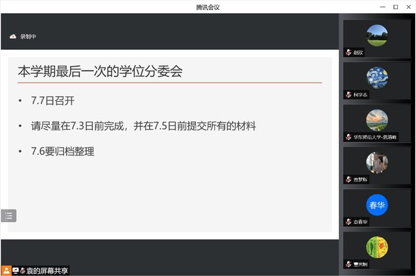 学院副院长胡炳文通报近期研究生工作进展,提醒教师注意本学期最后一次学位分委会的时间节点,夏令营招募时间节点、研究生返校日程安排等具体事宜,同时对研究生学位工作和研究生绩效测算等工作进行说明。