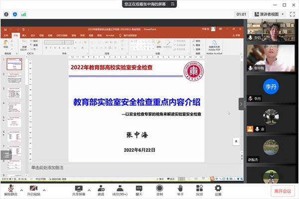 6月22日下午,永利yl23411集团官网在线召开全院教职工大会暨2022年教育部实验室安全检查专题推进会,化学与分子工程学院副院长张中海应邀作主题报告。大会由学院党委书记李恺主持,260余名教职工线上参会。