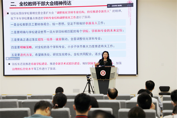李恺传达了学校暑期党委全委扩大会和全校教师干部大会会议精神,特别是强调了本学期学校在党的建设、卓越学术、卓越育人、队伍建设、国际合作、社会服务、资源保障、内部治理等方面重点工作内容。李恺强调,希望全院教师认真学习领会学校暑期党委全委扩大会和全校教师干部大会会议精神,以追求卓越的斗志,发扬艰苦奋斗的精神,立足岗位,干出实绩。
