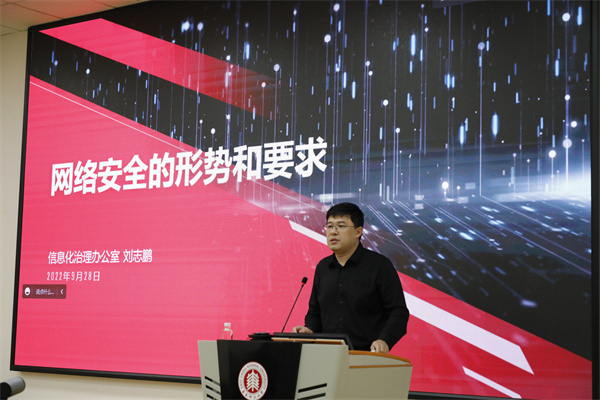 刘志鹏从近期国内高校网络安全事件案例切入,分析了网络安全工作中的薄弱环节和应对策略,提醒师生要认清日益严峻的网络安全形势,提高网络安全意识、积极了解网络等级保护相关政策法规。