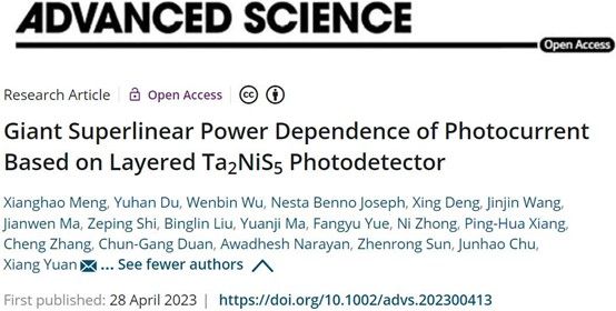 近日,永利yl23411集团官网袁翔课题组在基于二维窄带隙半导体Ta2NiS5制作的光电探测器中观测到超线性光电流。相关成果以《Giant Superlinear Power Dependence of Photocurrent Based on LayeredTa2NiS5 Photodetector》为题在《AdvancedScience》期刊上于2023年4月28日在线发表。