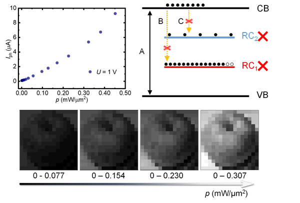 在该研究中,研究团队在基于二维层状材料Ta2NiS5制备的光电器件中,发现了超线性光电响应,报道了突破记录的超线性二维光电导系数。对于窄禁带的Ta2NiS5二维半导体,红外光谱的特征吸收证明了带隙内复合中心的存在,这些能态担任了光生载流子的重构中心并显著的影响了光电流随功率的变化。当光强较小时,重构中心中的空态较多,以较大的概率捕获光生载流子,从而抑制了光电转换效率;随着光强增加,特殊的重构中心构型导致其逐渐被填满,对光生载流子的捕获概率大大下降,从而导致了光电流的超线性增长。研究团队基于该器件进一步实现了超线性对比度成像。