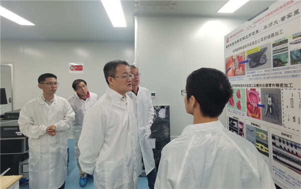 学术报告开始前,杜江峰院士参观了学院极端光机电实验室,课题组成员向杜院士介绍了上海市市级科技重大专项“超限制造”核心进展成果,展示了实验室面向化工制药、精密医疗器械等行业自主研发的三维内雕平台、精密旋切加工系统等超快激光加工设备及微纳化工芯片等新型器件。杜院士与课题组成员就超快激光制造原理与应用领域进行了深入交流。