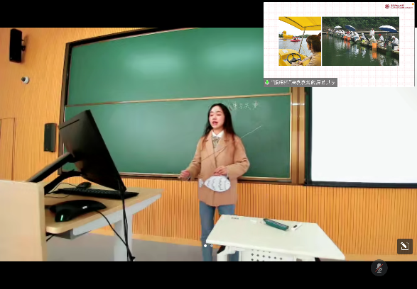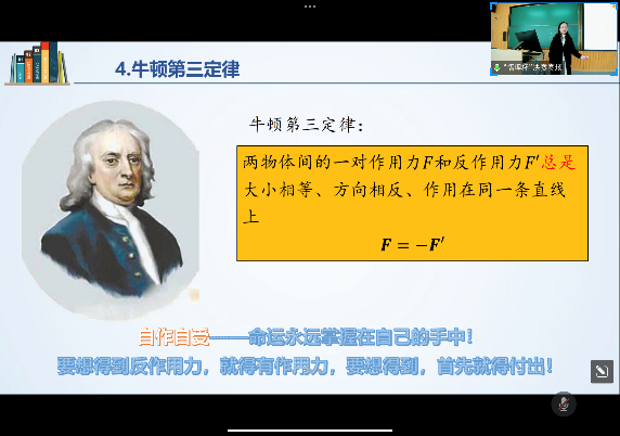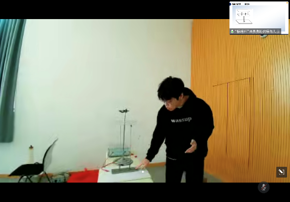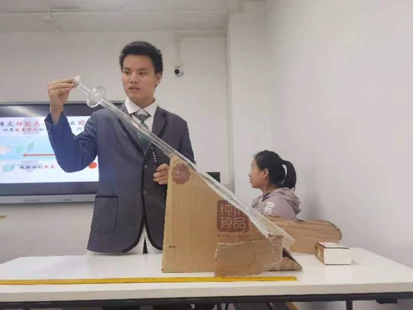 另外三位同学抽取到《牛顿运动定律的应用-超重和失重》赛题,陈佳妮同学通过回顾“测量重力常用的两种方法”引入,串联起初高中知识,课堂结构设置巧妙;杨惠钫同学通过“弹簧测力计拉手机”“纸袋拉砝码”“快速减肥”等多个小实验,调动学生的学习兴趣,增强了学生的课堂参与度;张航同学通过带领同学们“云游游乐场”的方式,对多个项目背后的超重、失重现象进行讲解,并通过自制“钓鱼”教具吸引学生的兴趣,教学方式非常新颖。