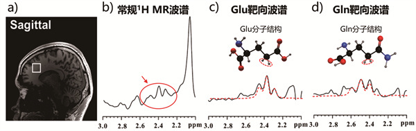 图2. a) 人脑的1H T1加权像;b) 常规1H 磁共振波谱;c) Glu靶向波谱; d) Gln靶向波谱。c和d图中红色虚线为理论信号曲线。波谱检测区域为图2a中白框所示人脑前额叶脑区。