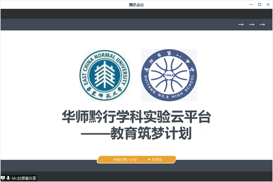 郭欣从办学目标、发展理念、育人方式、课程建设、教师队伍建设等多方面介绍了贵阳市第八中学的情况,着重介绍了学校物理教研组基本情况及不足。他谈到,贵阳市第八中学建校近70年来,坚持扎根贵州大地、传承“以德为先,求真笃行”的办学理念,不断强化办学目标、创新变革育人方式、加强师资队伍建设,致力于打造人文底蕴深厚,有科技特色示范高中。希望借助“教育筑梦”,促进学校基础教育一线物理教师的专业成长,助力青年教师实现教育梦想。